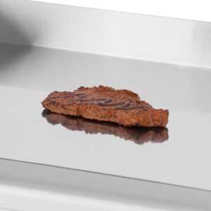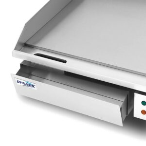 Ηλεκτρικό πλατώ χρωμίου με επιχρωμιωμένη πλάκα ψησίματος και ανοξείδωτη κατασκευή. Εύρος θερμοκρασίας από 50-300°C και θερμοστάτης στους 300°C. Διαθέτει συρτάρι συλλογής υπολειμμάτων. Το μηχάνημα είναι κατασκευασμένο από ανοξείδωτο ατσάλι, με κομψό σχεδιασμό και λεία επίπεδη επιφάνεια, όμορφο χρώμα και υλικό ανθεκτικό στη βρωμιά για εύκολο καθάρισμα. Το σύστημα υψηλής απόδοσης και η διατήρηση της απαιτούμενης θερμοκρασίας, εξασφαλίζει ευκολότερο μαγείρεμα.